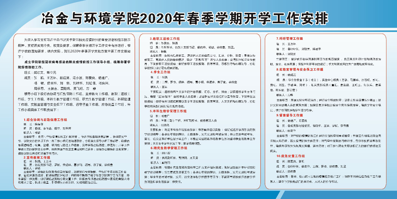 公司成立由公司党委书记和经理为组长,各分管院领导、教工支部书记、研究所所长等为组员的学院新冠肺炎疫情防控工作领导小组,统筹部署学院疫情防控工作。领导小组下设综合协调与后勤保障工作组、宣传教育工作组、教职工返校工作组等10个工作小组,明确工作职责、小组成员和联系人,全面部署开学后疫情防控和师生返校工作,做到分工明确,责任到人。