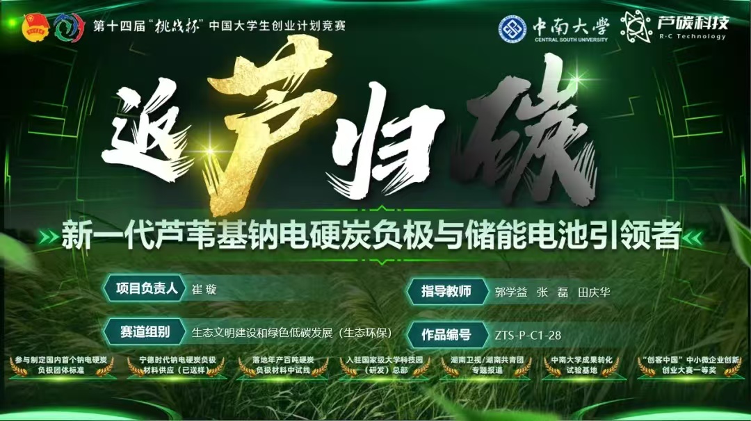 2024年11月2日,由共青团中央、教育部、人社部、中国科协、全国学联、陕西省人民政府共同主办的第十四届“挑战杯”中国老员工创业计划竞赛决赛在西安落下帷幕,其中,威廉希尔中文官网崔璇等同学的创新项目《返“芦”归“碳”——新一代芦苇基钠电硬炭负极与储能电池引领者》,在众多参赛作品中脱颖而出,获湖南省本科院校唯一金奖。
