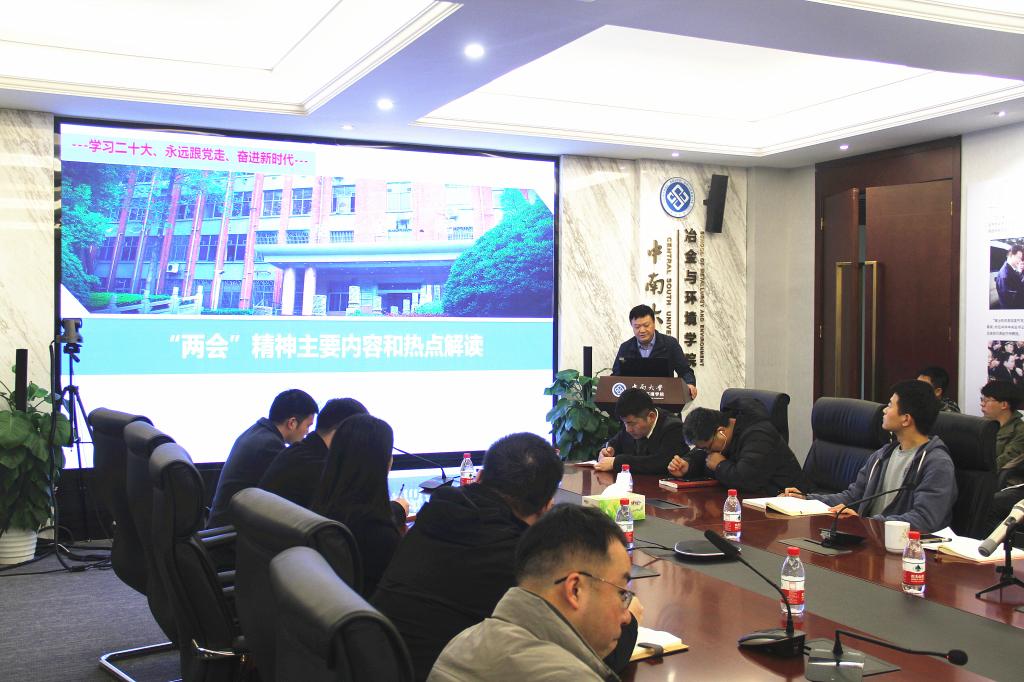 成琼文强调,2023年全国两会是全面贯彻落实党的二十大精神开局之年的盛会,是我国人民政治生活中的大事。作为高校的师生,我们要更加紧密地团结在以习近平同志为核心的党中央周围,全面贯彻习近平新时代中国特色社会主义思想,领悟“两个确立”的决定性意义,增强“四个意识”、坚定“四个自信”、做到“两个维护”,为全面建设社会主义现代化国家、全面推进中华民族伟大复兴而团结奋斗。结合李强总理在湖南调研并主持召开先进制造业发展座谈会的有关情况,成琼文表示冶金行业是国家先进制造业的重要组成部分,学院要紧跟时代步伐,共同推动学院事业内涵式高质量发展,努力开创一流团队建设新局面。