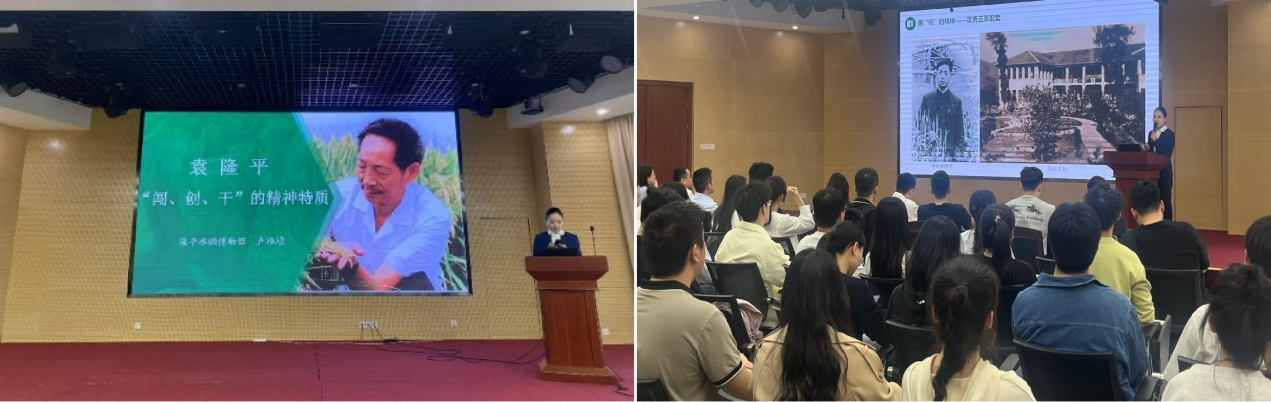 随后博物馆讲解员卢雅静老师为全体师生党员讲授微党课《袁隆平的“闯、创、干”精神特质》。卢老师生动地讲解,让大家对袁隆平院士敢为人先的“闯”劲、勇于创新的“创”劲、脚踏实地的“干”劲有了更为透彻地理解。她指出,粮食安全至关重要,袁隆平院士的成就不仅是科技突破,更是对“端牢中国饭碗”使命的担当。