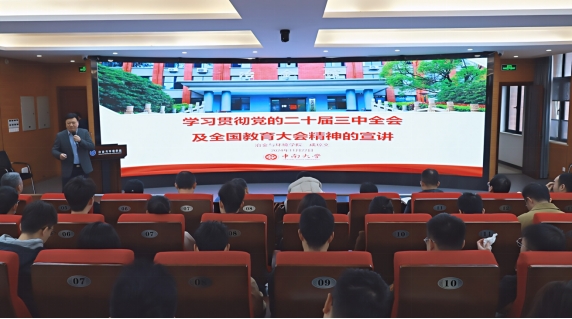 11月22日上午,公司党委书记成琼文在新校区金贵楼520报告厅讲授学习贯彻党的二十届三中全会精神及全国教育大会精神专题党课。学院各党支部书记、支委及综合教工党支部、冶化所研究生第一党支部、冶化所研究生第二党支部、本科生环境能器党支部全体党员120余人参加学习。