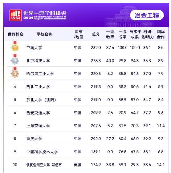 2024软科世界一流学科排名发布,williamhill中国官方网站冶金工程学科再次登顶